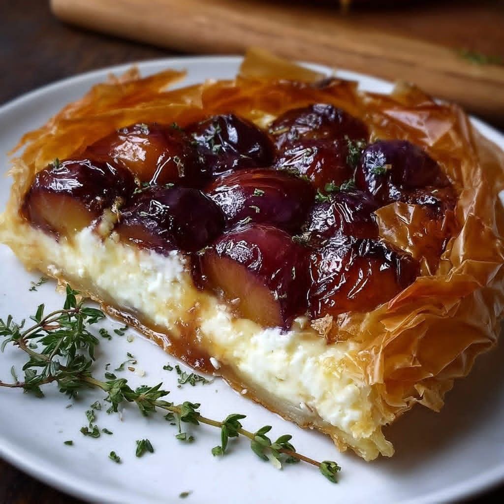 This Caramelized Grape and Cheese Tart combines the richness of creamy cheese with the sweetness of caramelized grapes, all encased in crispy phyllo dough. The slight herbal note from fresh thyme adds a delightful complexity to this dessert. Perfect for a special occasion or as an elegant treat, this tart is as beautiful as it is delicious.