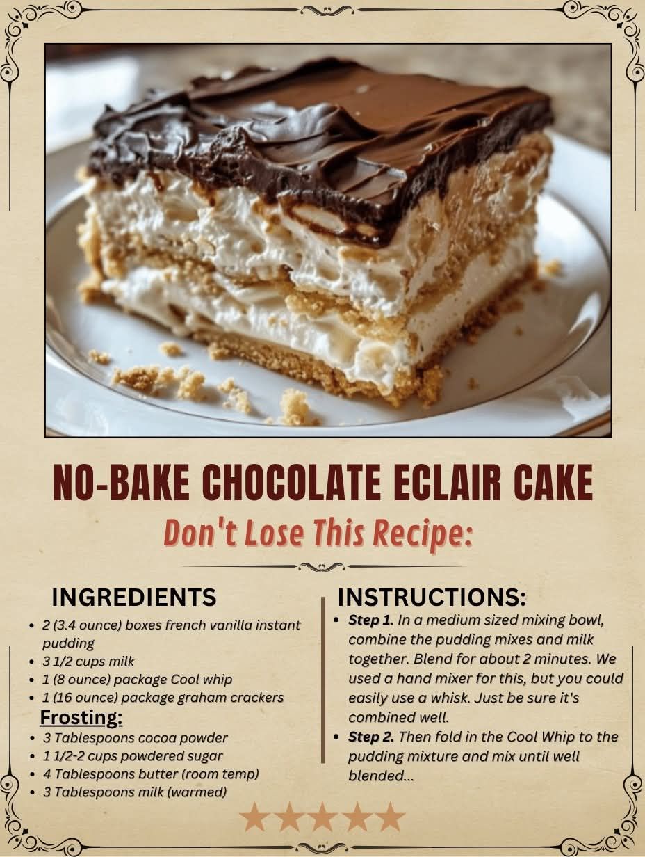 No-Bake Eclair Cake is a dessert that is layers of flavor: graham crackers, instant vanilla pudding, whipped topping and topped with chocolate frosting!